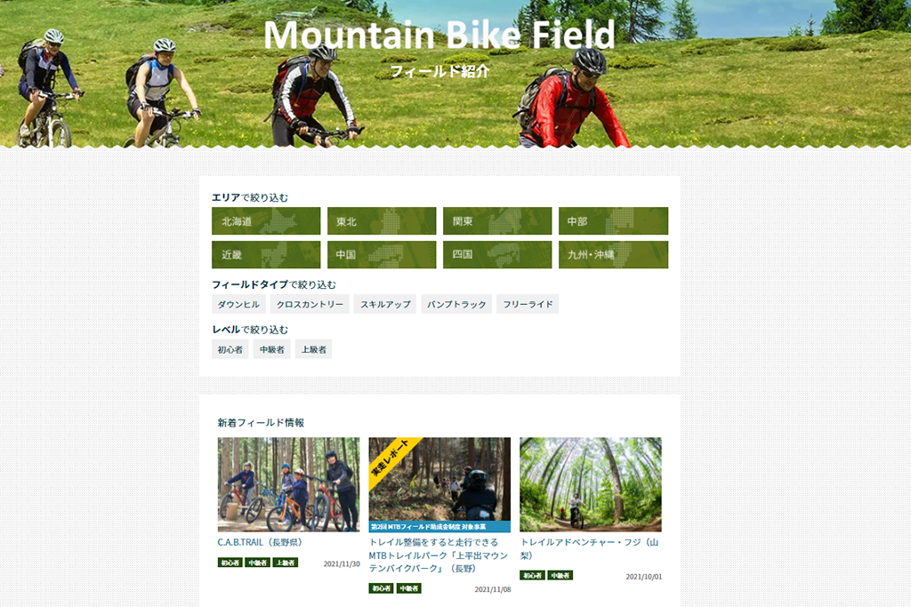 サイト内にあるマウンテンバイクのカテゴリーに「フィールド」というページがあり、こちらに全国のMTBフィールドの情報が掲載されています。
