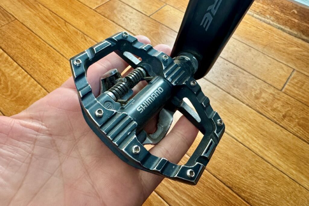 今回の自走にあたり、車体には軽微なカスタマイズを施しました。歩道を走行する可能性も考慮し、ハンドル幅は法令で定められた「普通自転車」の規定である60cm以下にカット。前後ライトに加え、パンク修理キットなどを収納したサドルバッグを装着しました。本格的な走行ならビンディングペダルが理想的ですが、今回は移動の気楽さを重視し、スニーカーで気軽に乗れるフラットペダルの組み合わせを選択しています。